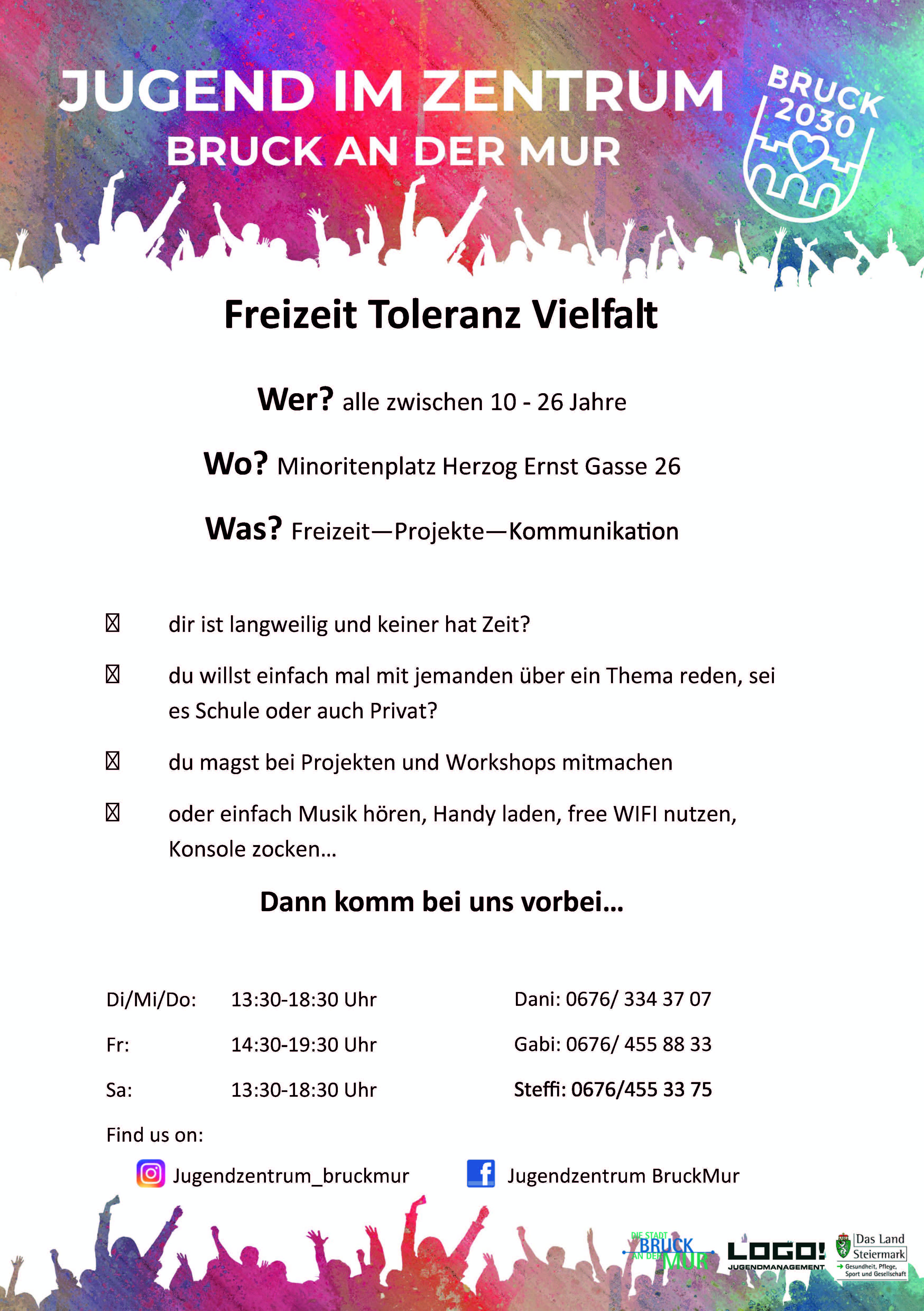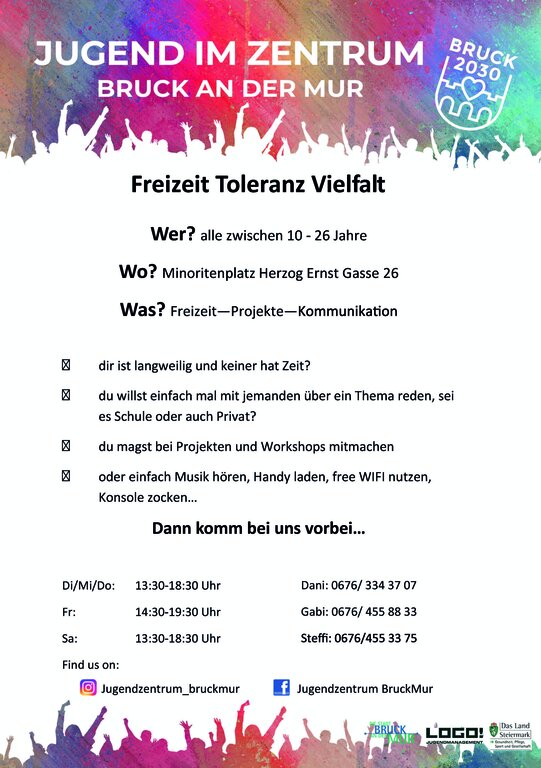 Offene Jugendarbeit: Der Standort des Brucker Jugendzentrums befindet sich in der Herzog-Ernst-Gasse 26 a/Ecke Minoritenplatz direkt im Zentrum und wird vom qualifizierten Team von LOGO Jugendmanagement betreut.