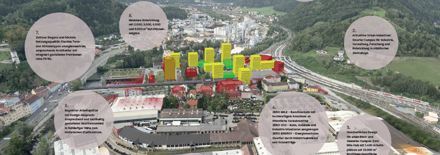 Die Stadt Bruck an der Mur im Zentrum des industriellen Ballungszentrums Mur/Mürz Furche ist einer der zentralen Verkehrsknotenpunkte in Österreich. Aufgrund der topografischen Lage müssen öffentliche Einrichtungen, Wohn- und Freizeitgebiete, Handel, Tourismus, Verkehrsinfrastruktur und Industries auf engstem Raum nachhaltig koexistieren. Um in Zukunft nachhaltige ökologische und ökonomische Perspektiven zu bieten, will Bruck eine „grüne“ Vision entwickeln.